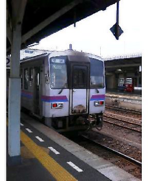 やってきた列車は写真のようなお姿。改造前を念頭にBefore→Afterといった感じで見ると、なかなか微妙になった顔立ちで……。車内放送で曰く、クルージング船をイメージしたものだそうで。架線張ってあるのにディーゼルカーなあたりは船らしいかな。
